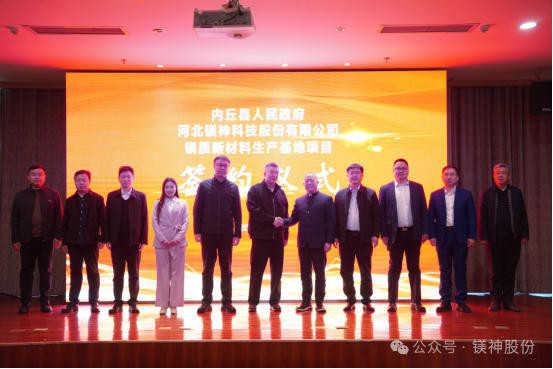 2025年3月28日,河北鎂神科技股份有限公司與內丘縣人民政府在阿爾卡迪亞酒店悅盛廳隆重舉行鎂質新材料生產基地項目簽約儀式。該項目總投資20.25億元,選址邢臺市內丘縣工業園區,致力打造世界級高端鎂質新材料生產基地,為區域經濟高質量發展注入新動能。