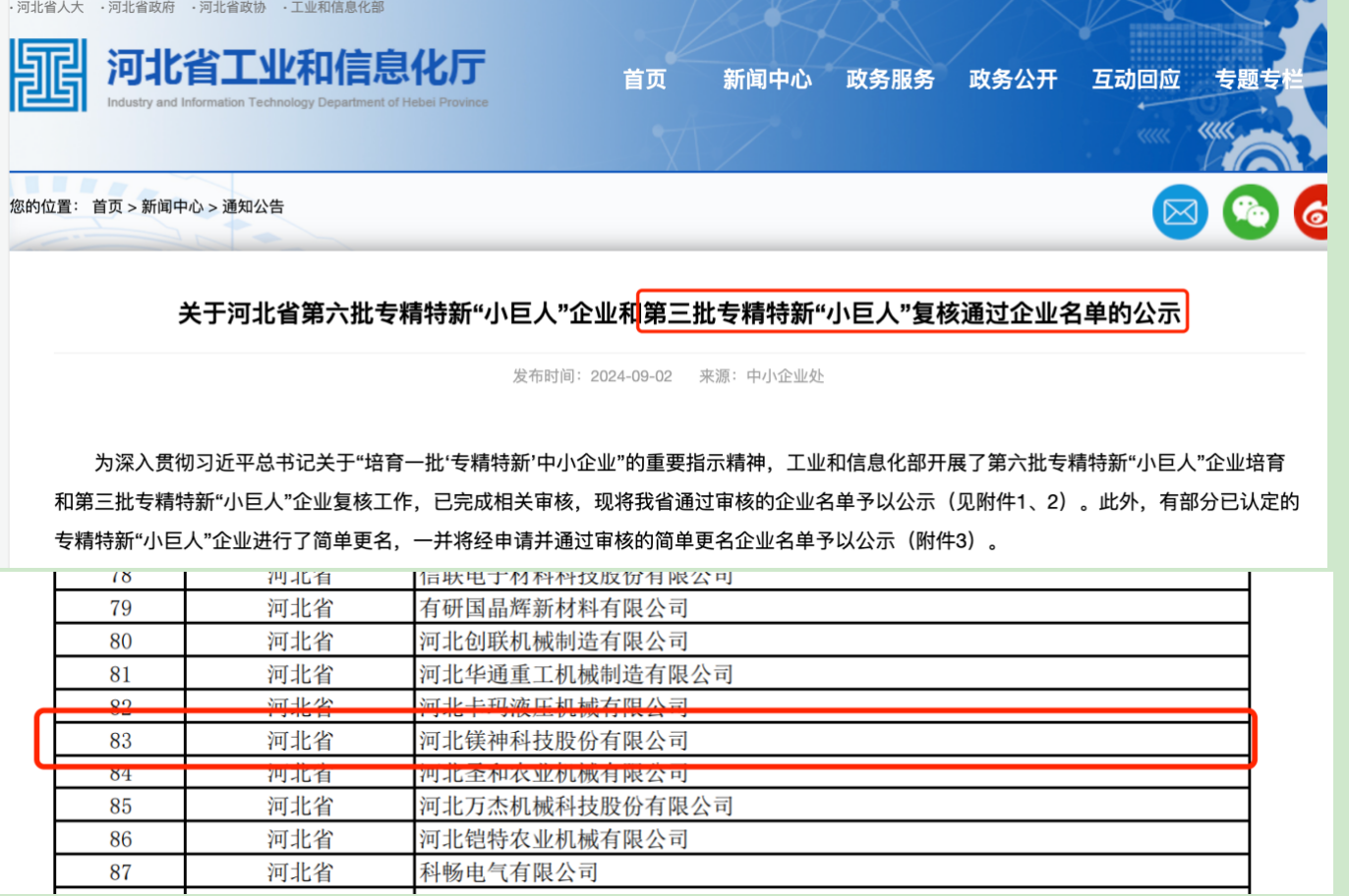河北鎂神科技股份有限公司近日喜訊連連,成功通過了國家級“專精特新小巨人”企業的復審。