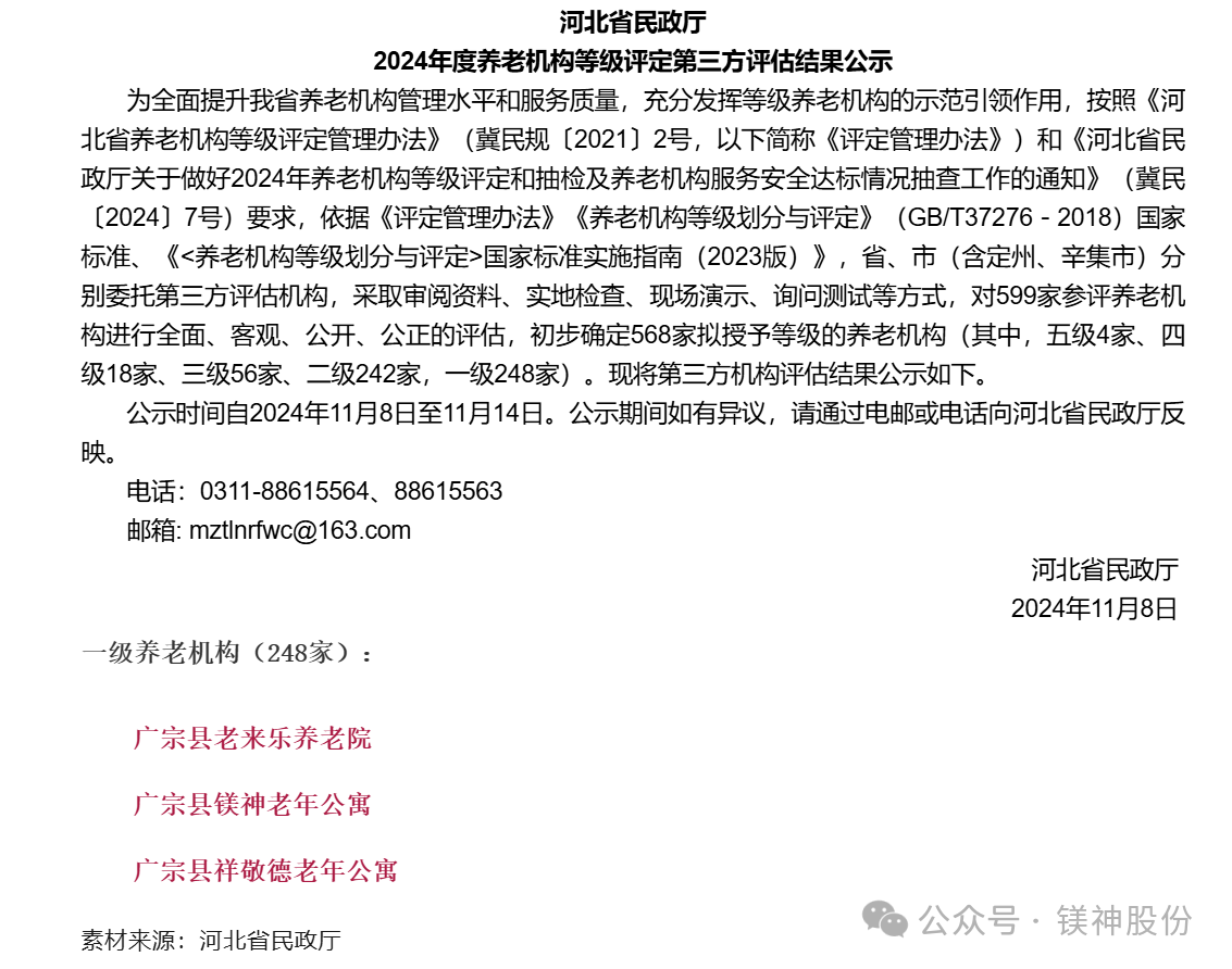近日,河北鎂神科技股份有限公司旗下的廣宗縣鎂神老年公寓通過養老機構等級評定,獲河北省一級養老機構。